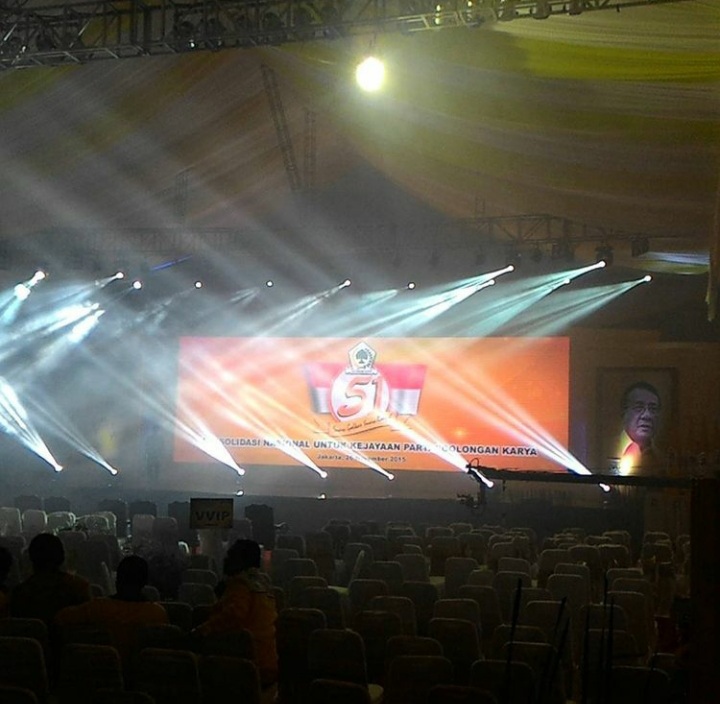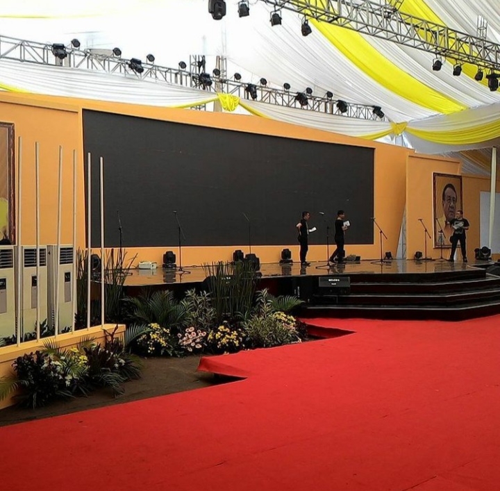 speaker (sound system), layar LED, atau dekorasi, sehingga acara di bawahnya
