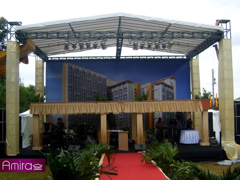 speaker (sound system), layar LED, atau dekorasi, sehingga acara di bawahnya